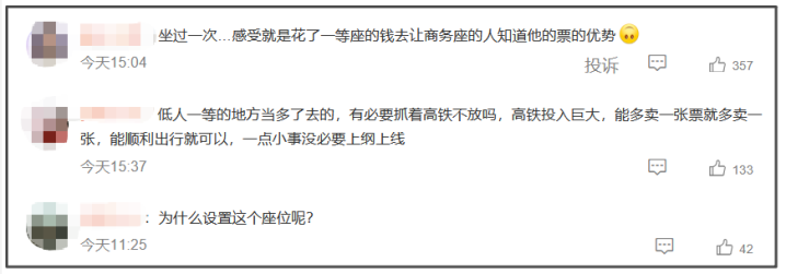 也有网友认为,高铁别离商务座、一等座、二等座,粗莽了乘客各样化需求,也加多了运力,不应谩骂。