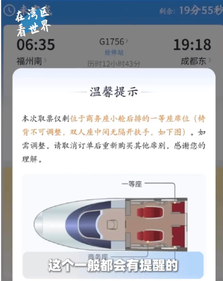 近日,有网友在12306APP购票时,发现弹出温馨指示:本次取票仅剩位于商务座小舱后排的一等座位(椅背不可颐养,双东谈长官中间无离隔扶手)。如需颐养,请取消订单后从头购买其他席别。