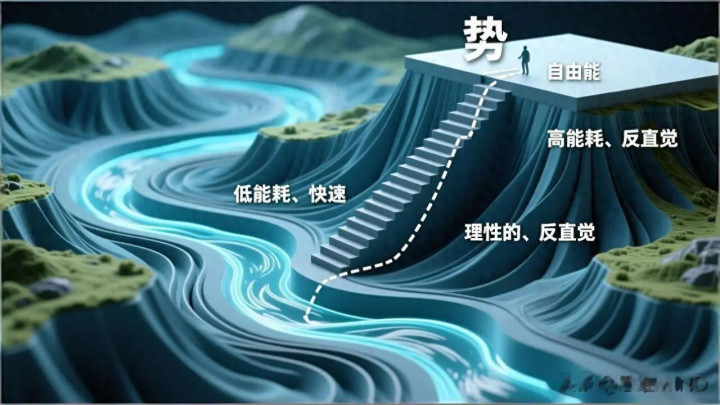 直觉如河流,顺地势而下,寻求最低能耗路径;理性如水泵,逆势而上,开辟新的可能性;智慧如整个水系的管理者,既理解河流的自然倾向,也知晓水泵的代价与价值,在水资源、地貌和生态的长期平衡中做出选择。