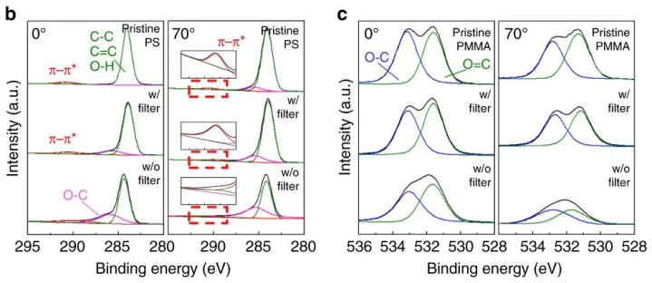 图12XPS光谱,分别是PS(b, C1s)和PMMA(c, O1s)均聚物:经过滤光等离子体处理(200瓦,60秒)和无滤光等离子体处理(200瓦,10秒)后,入射角为0°和70°,保持完好。DOI:10.1038/s41467-019-10907-5