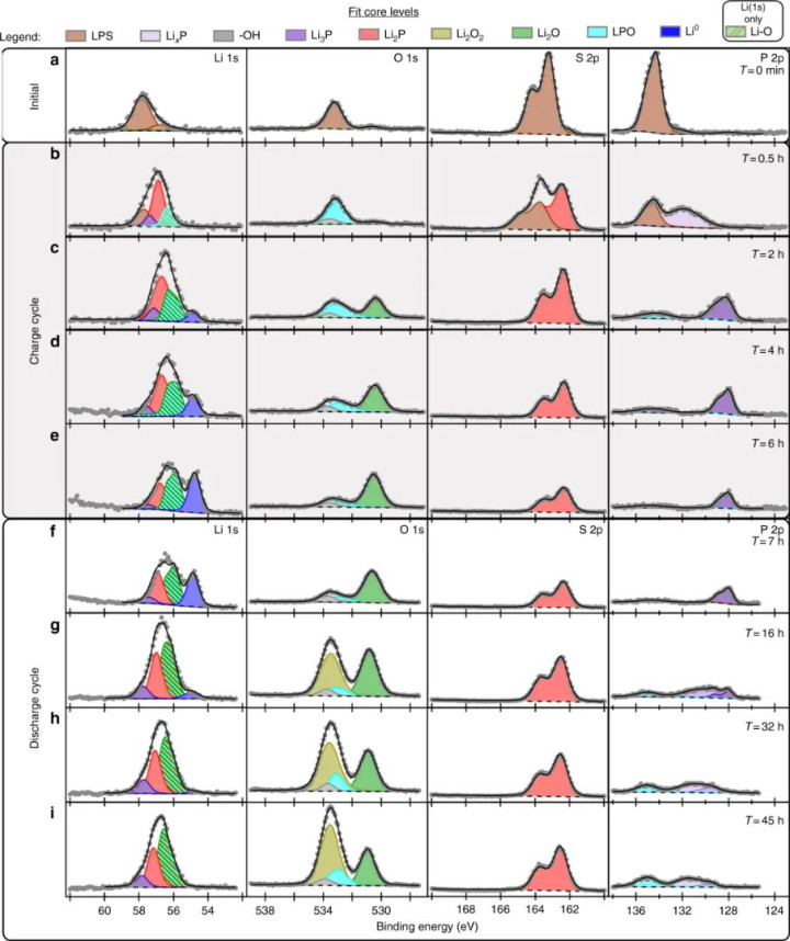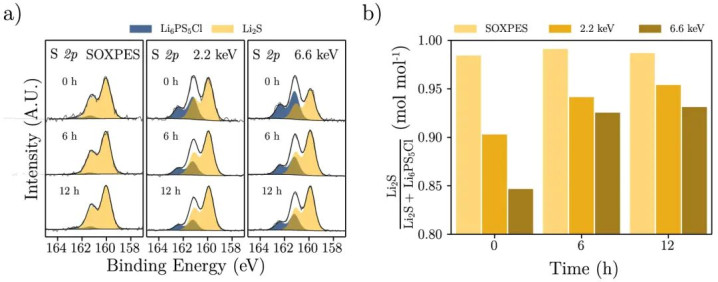 图7随着锂(Li)在材料表面蒸发时间的增加(0h, 6h, 12h),硫(S 2p)和磷(P 2p, P 2s)元素的结合能谱图变化。DOI:10.1038/s41467-025-64357-3