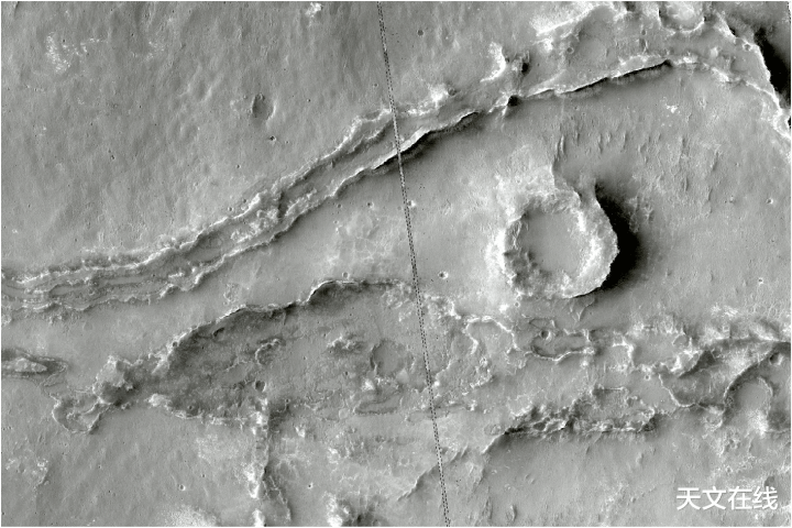 图示的两条脊标志着两条古老河流在下游汇合的地方。在两个脊之间,我们可以看到一座平顶山,它可能是导致河流分流的某种坚硬物质。(图片来源:NASA/JPL/亚利桑那大学)
