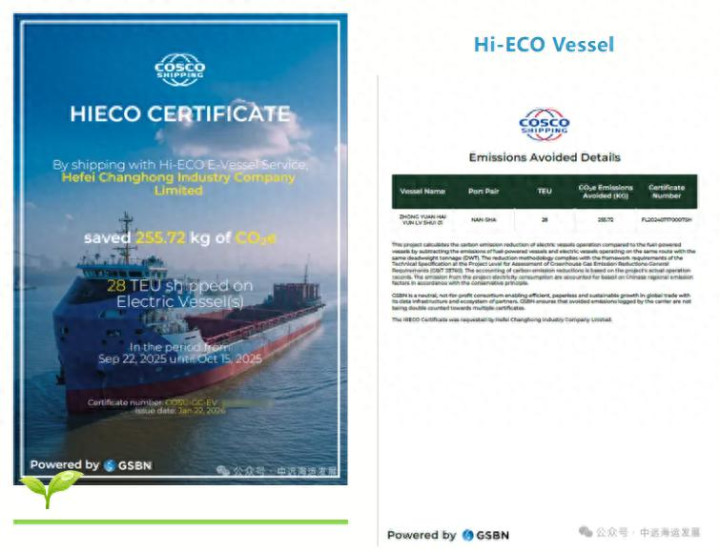 近日,中远海运发展与中远海运集运依托产业协同优势,围绕“绿色船舶+绿色服务”融合创新,推出基于700TEU电动集装箱船的行业首创体系——Hi-ECO E-vessel(电动船绿色运输服务)。据了解,该体系已向中国家电行业知名品牌长虹电器成功签发全国首张Hi-ECO E-vessel证书,标志着电动船绿色运输服务在标准化、可量化、可追溯方面实现了可复制的落地实践,为航运业零碳转型提供了新的应用样板。