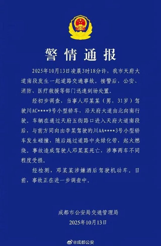 此前,成王人警方曾通报,事发于2025年10月13日凌晨3时18分许,事故酿成驾驶东说念主邓某某物化,涉事两车不同过程受损;驾驶东说念主涉嫌酒后驾驶生动车。
