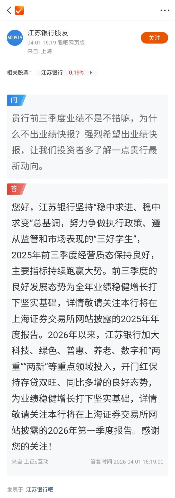 4月初,有投资者在江苏银行股吧中敕令走漏事迹快报。江苏银行对此讲述称“2025年前三季度的考究发展态势为全年龄迹郑重增长打下坚实基础”。