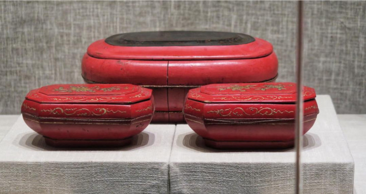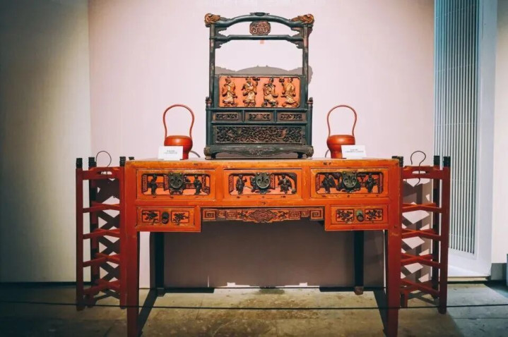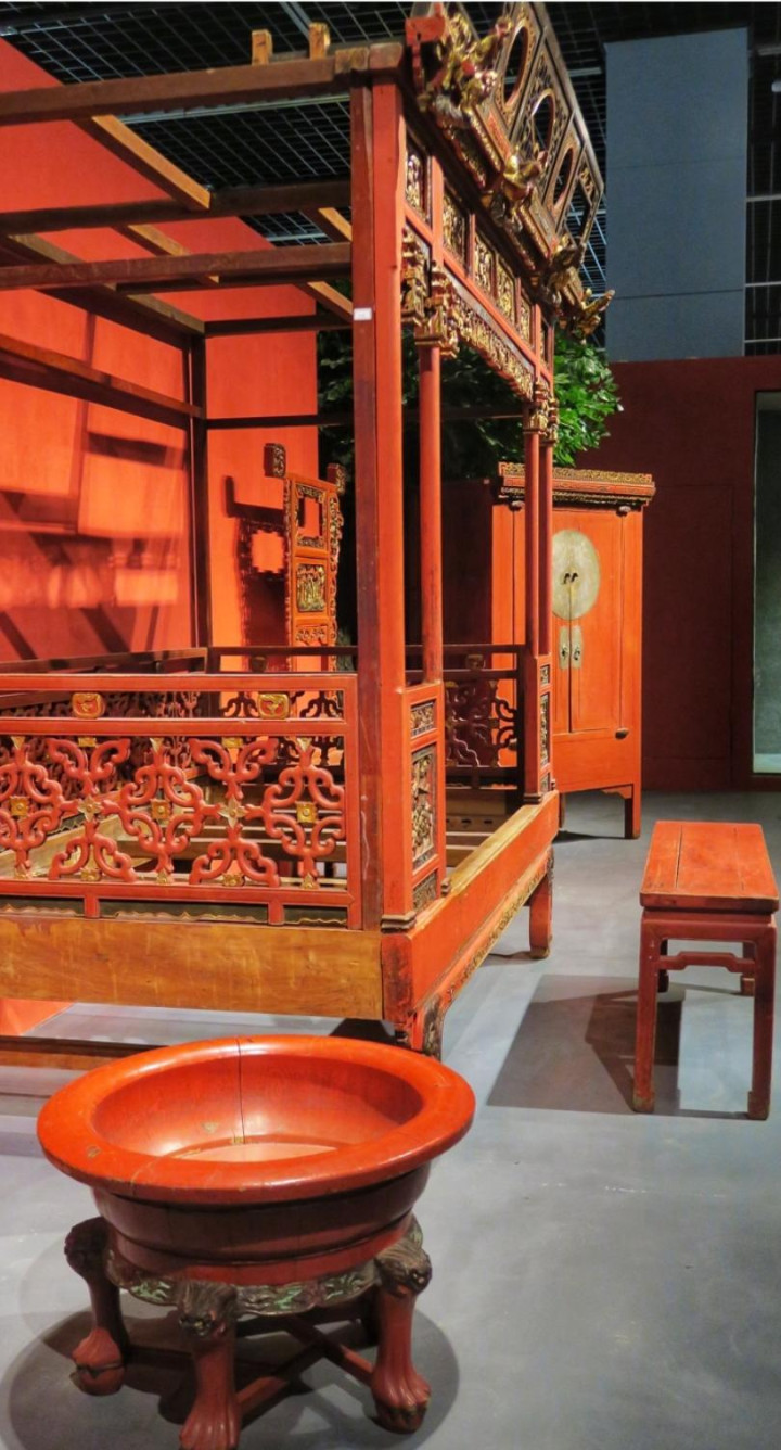 所谓红妆,并不单是指色调上的朱红亮丽,而是囊括了婚房摆设、起居日用、女红器物在内的齐全体系,小到针线盒、胭脂盒,大到橱柜、桌案,无一不是髹朱红大漆点缀,喜庆而慎重。
