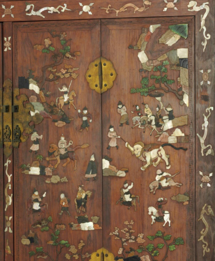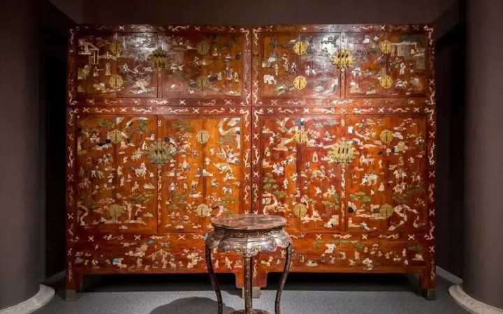 故宫藏的一双黄花梨百宝嵌东说念主物图顶箱柜,左证清宫摆设档臆想,应为乾隆天子即位前的旧物,且可能是乾隆帝与孝贤纯皇后成亲时,送给皇后富察氏的礼物,曾摆设于重华宫西暖阁。