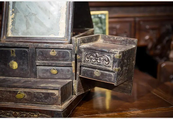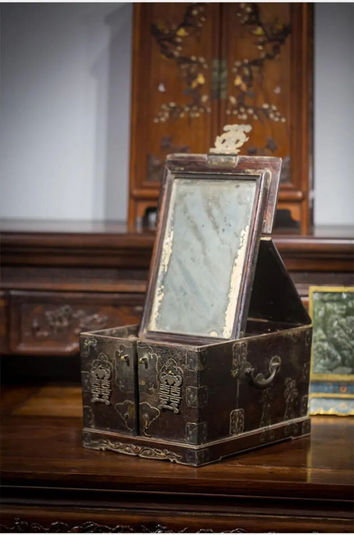 明清手艺的梳妆台形制千般,朴素些的镜台外形呈“箱”形,未翻开时不雅之神态与官皮箱有些雷同,翻开后可将镜子架于中间,里面置有小抽屉,摒弃胭脂、水粉、梳篦等梳妆用品,多者可达到五个以上。