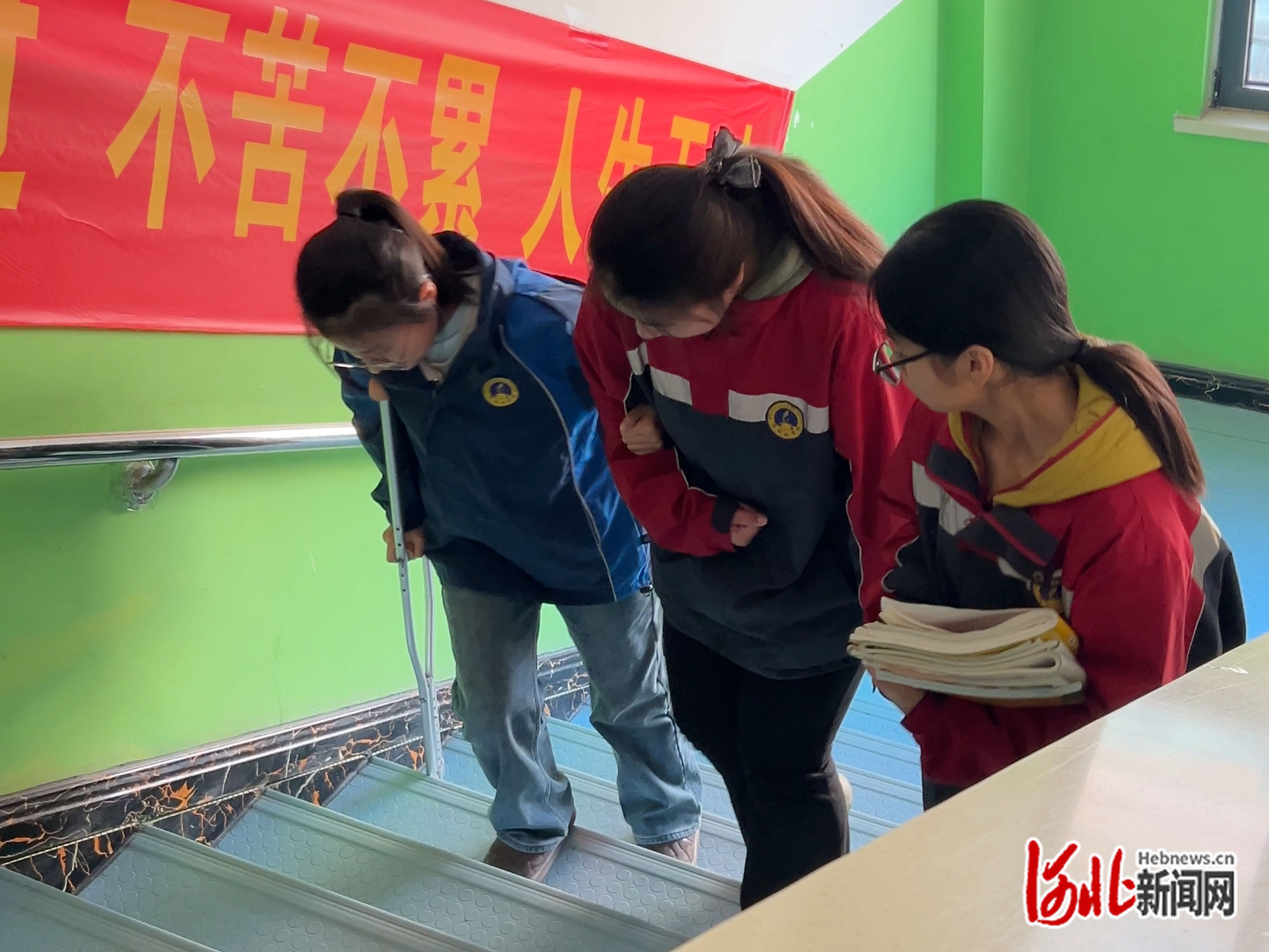 上课前同学们搀扶刘若寒丰足到教室。保定市宏利佳高档中学供图