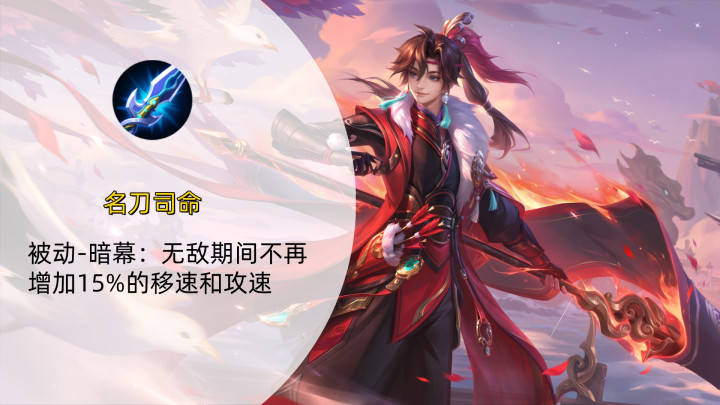 名刀司命的被迫【暗幕】收缩,无敌本领不再增多15%的移速和攻速加成。